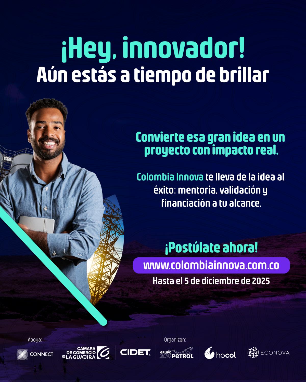 Con esta iniciativa, las entidades aliadas reafirman su compromiso con la innovación, la sostenibilidad y el desarrollo de nuevas tecnologías que aporten a la transición energética y a la protección del medioambiente. https://colombiainnova.com.co/